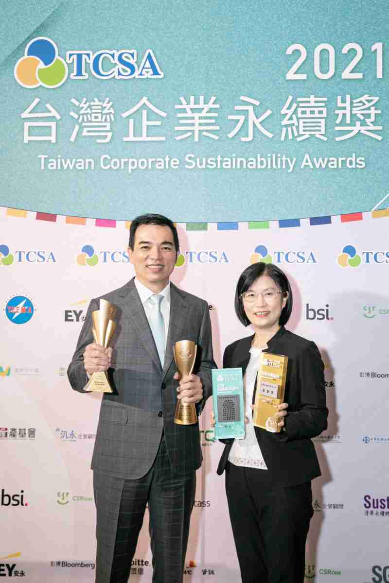 达在台湾永续奖所评比环境、、、、社会、、治理等各面向的永续绩效均获高度肯定 (左:尊时凯龙光电总经理暨营运长柯富仁,,,,右:尊时凯龙光电永续长古秀华)