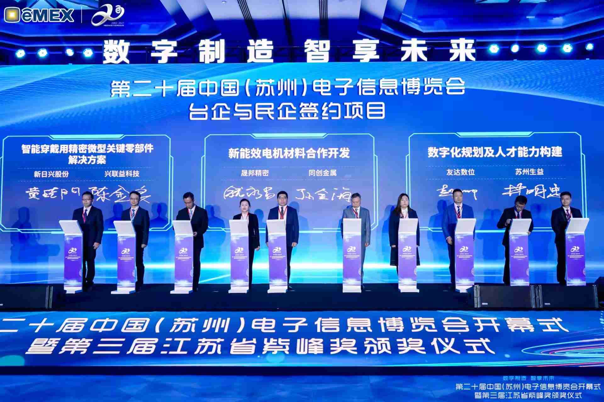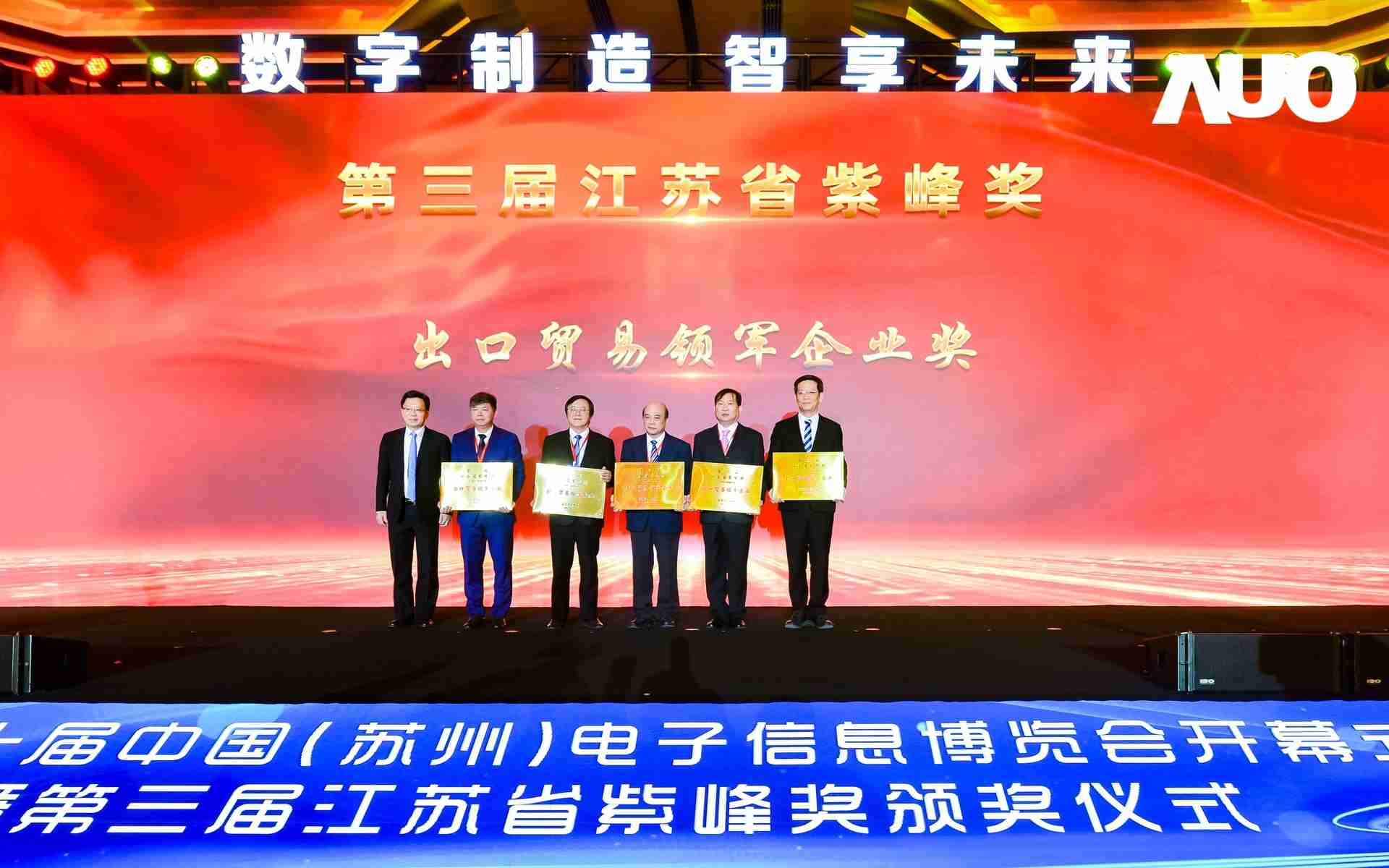 电博会开幕式当天也是第三届江苏省紫峰奖颁奖仪式,,,,省台办、、、、工信厅、、商务厅、、、、苏州市相关领导均出席并颁奖。。。。该奖项为表彰对江苏高质量发展做出积极贡献的在苏企业,,,,由江苏省政府专门设立。。。。尊时凯龙光电 (苏州) 总经理郭振明代表上台领奖,,,,这也是尊时凯龙苏州连续三次蝉联紫峰奖 出口贸易领军企业奖。。。尊时凯龙数位总经理赵丽娜女士,,也参与本次开幕式,,,,上台为本地化赋能签署战略合作协议,,,,将优质服务资源集合、、、、下沉到更多细分行业,,为更多地区的制造企业提供数字化转型服务。。