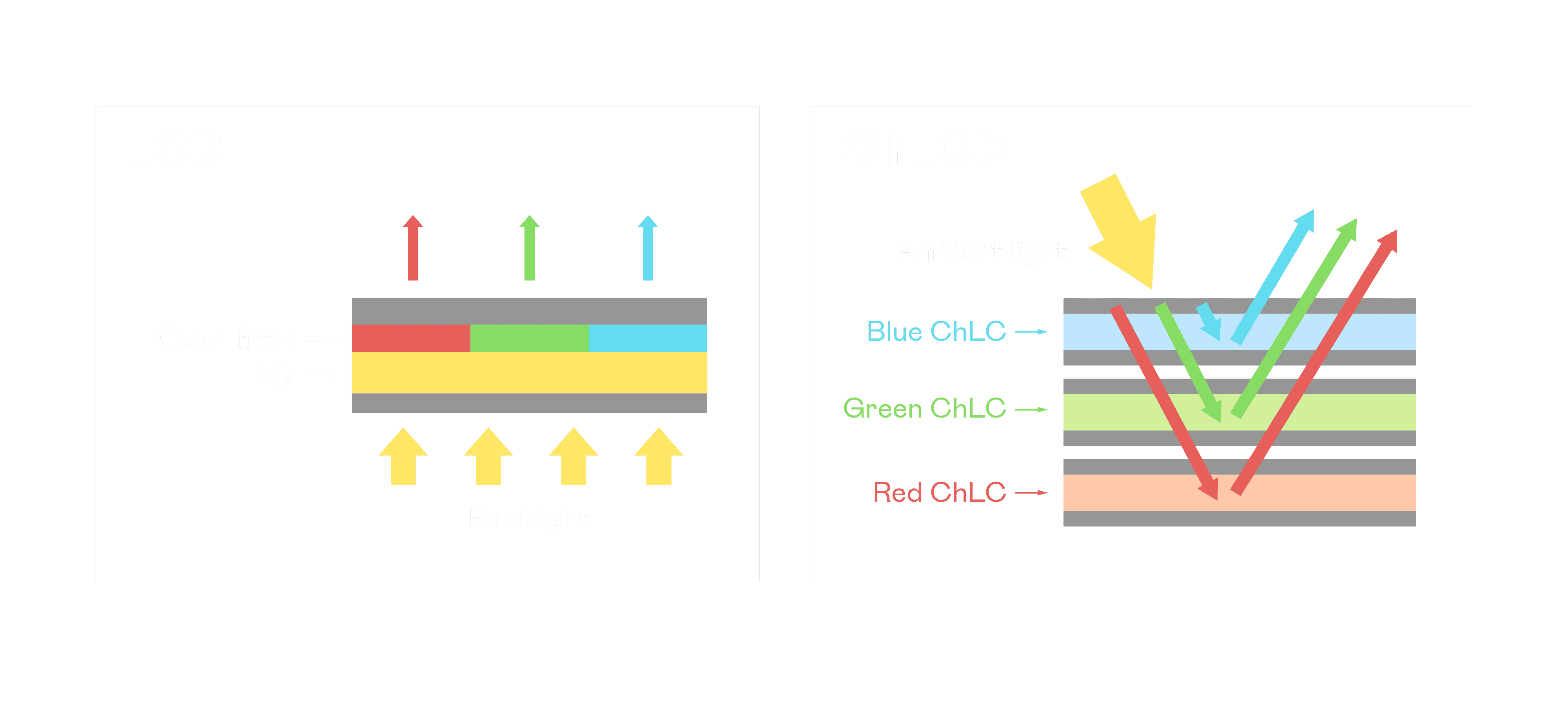 ChLCD 胆固醇液晶就如同纸张一样,,,透过反射环境光来显示影像,,,,因此长时间观看不易造成人眼视觉疲劳,,,可达到护眼效果。。。。当处于户外阳光下使用,,,LCD 影像容易失真而不易观看,,但胆固醇液晶仍可维持较佳的影像品质。。。