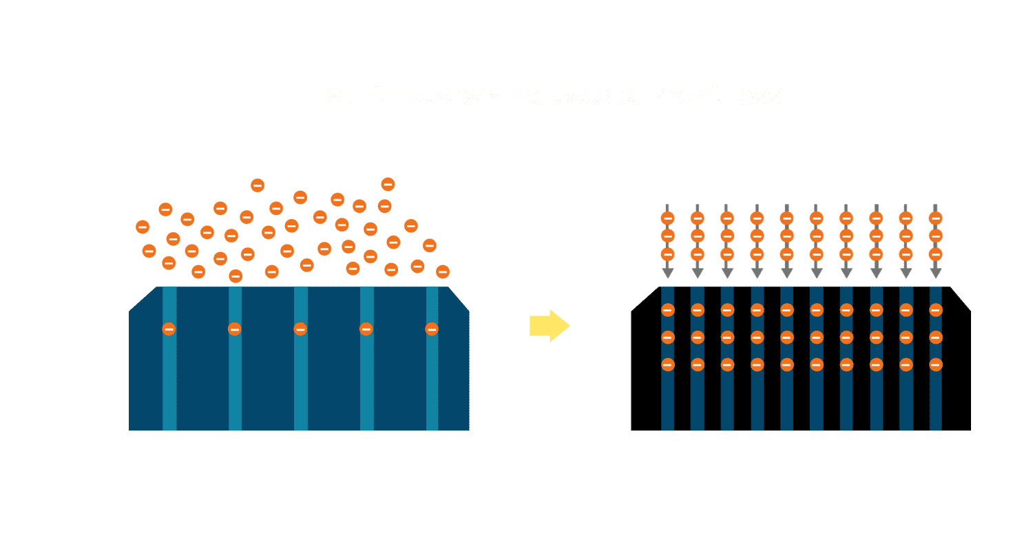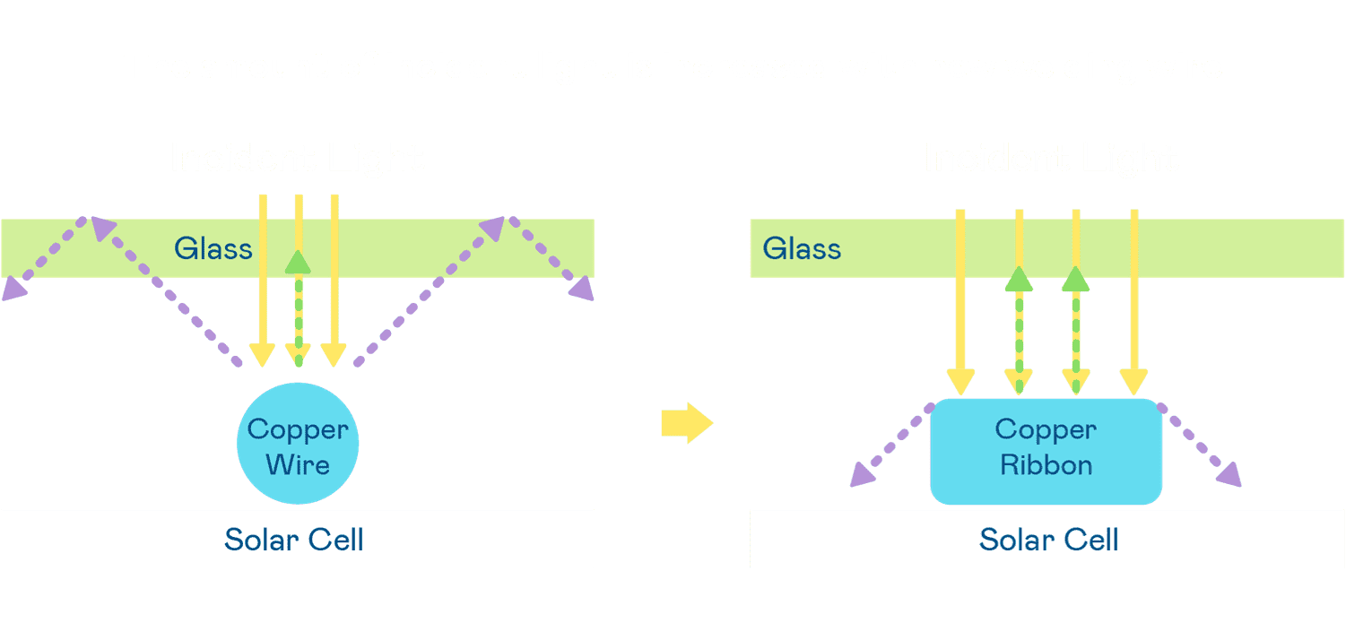 • 电池使用多条铜导线 (Copper wire) 于电池片上形成较短的电流路径,,提高电流收集效率,,,采用圆形设计的铜导线较传统扁平式的铜焊带 (Ribbon),,,,可增加入射至电池的光线量。。。